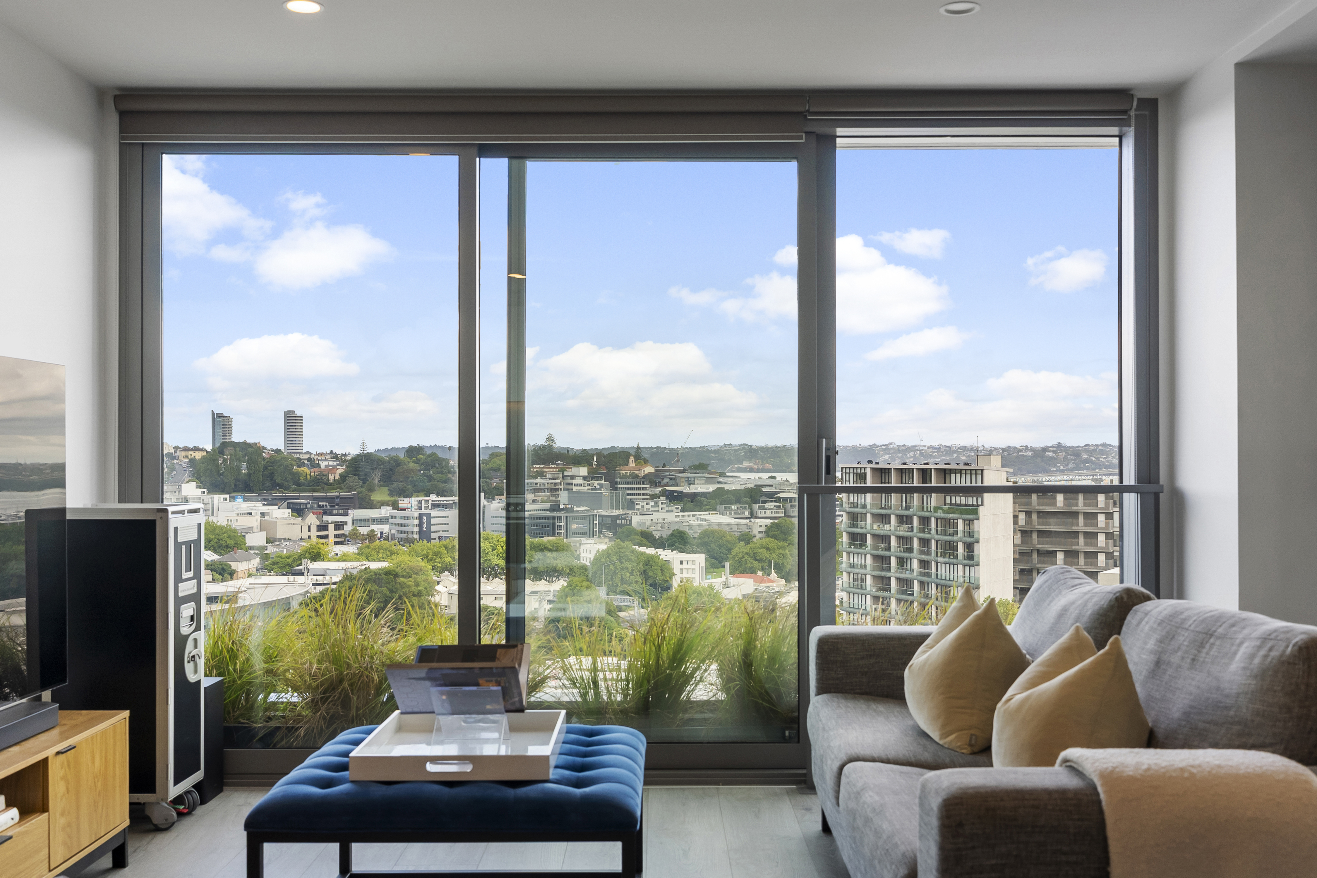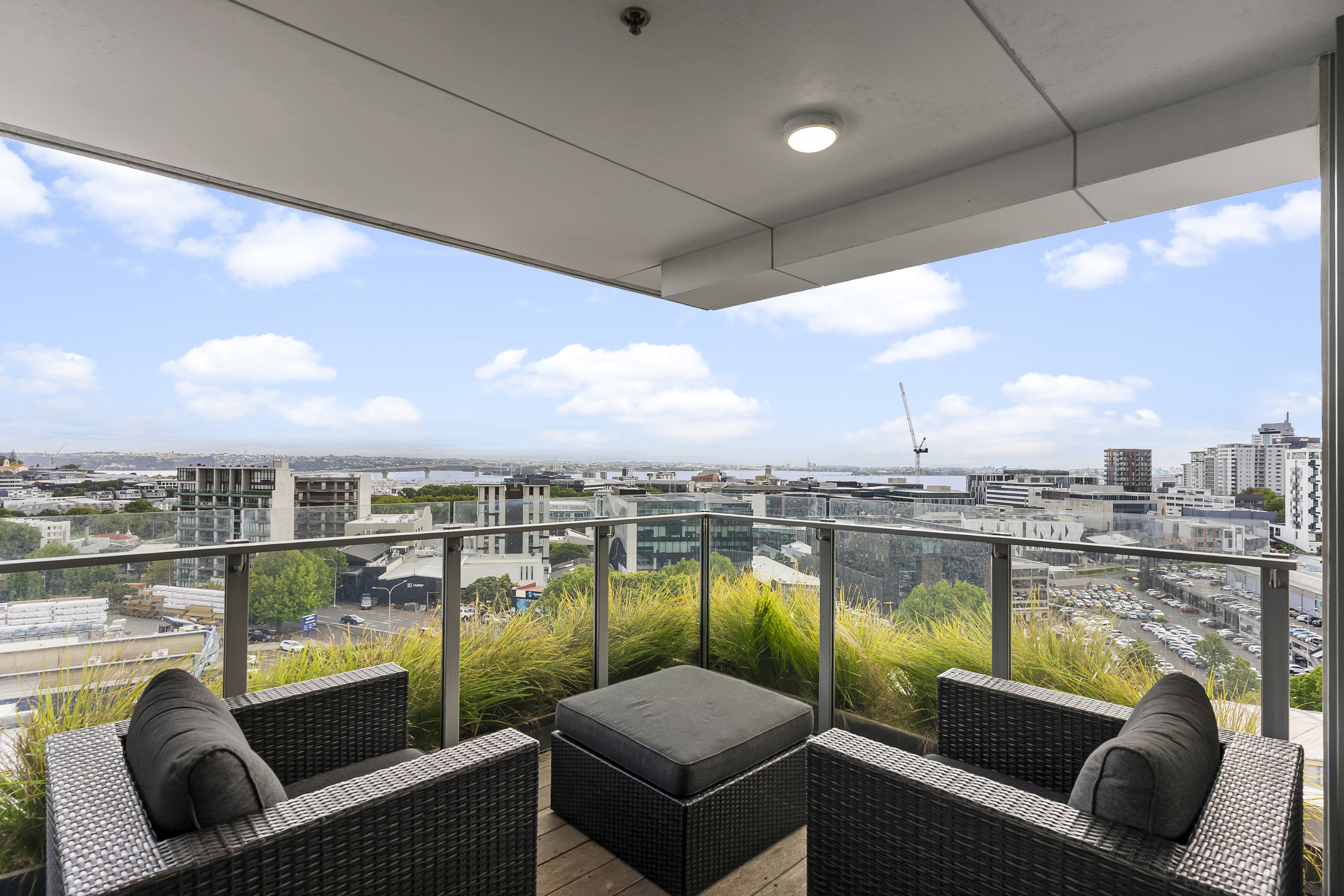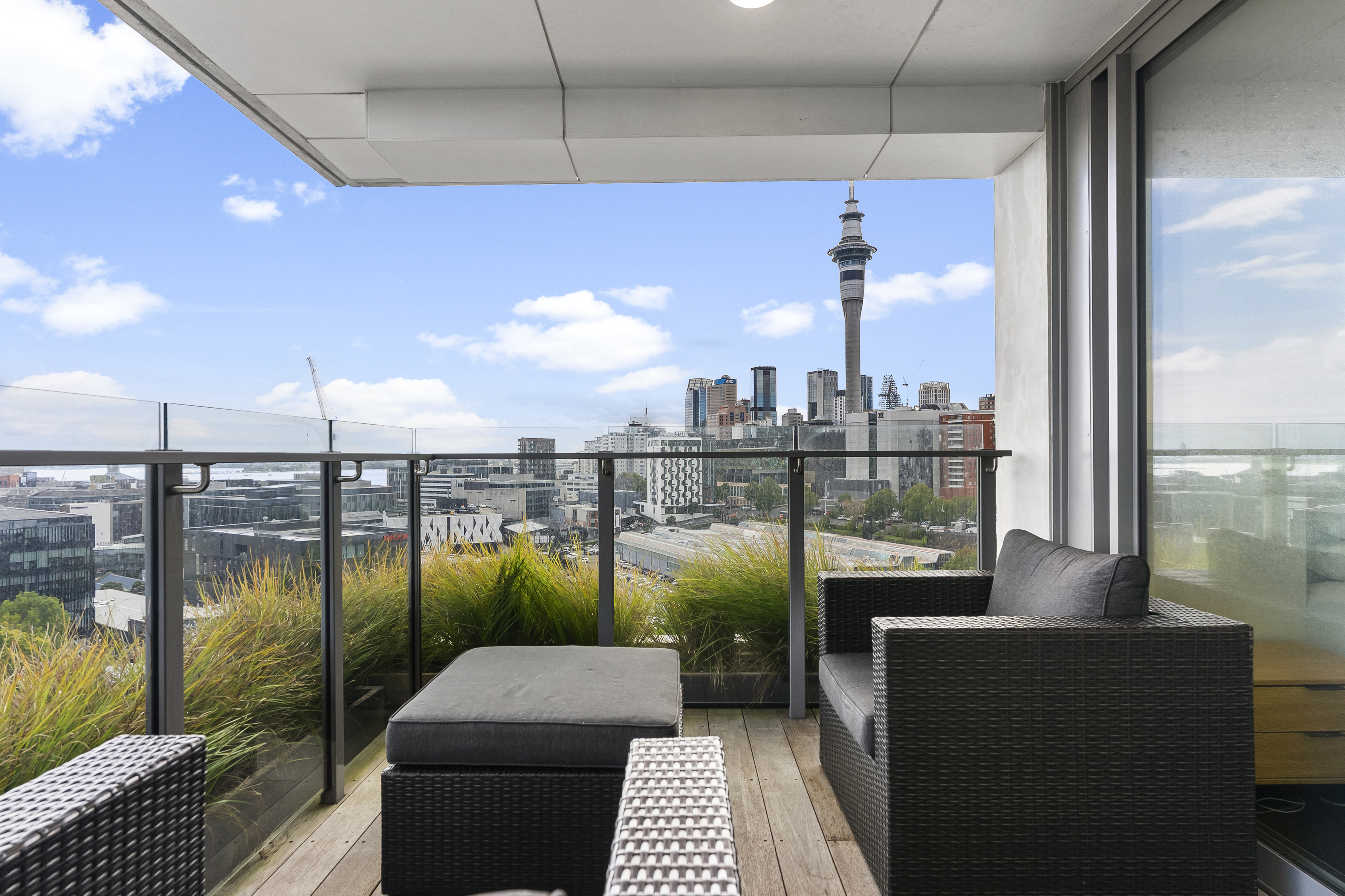Positioned on the 7th floor in a premium north-facing corner position, this stunning city apartment captures sweeping views across the harbour, Auckland skyline and the iconic Sky Tower. Both the living area and main bedroom centre around a spectacular outdoor terrace, seamlessly connected via large sliding doors - creating effortless indoor-outdoor flow and an incredible vantage point to soak in the views. A generous bonus second room adds excellent flexibility - ideal as a home office, guest space or additional living area. The spacious open-plan kitchen, dining and living area is finished with modern-toned flooring and flows naturally to the terrace for comfortable everyday living or entertaining. A beautifully appointed, fully tiled bathroom adds a touch of luxury and contemporary style, while ducted air conditioning and heating throughout ensures year-round comfort. Whiteware to remain for tenant use - washer, dryer & fridge.