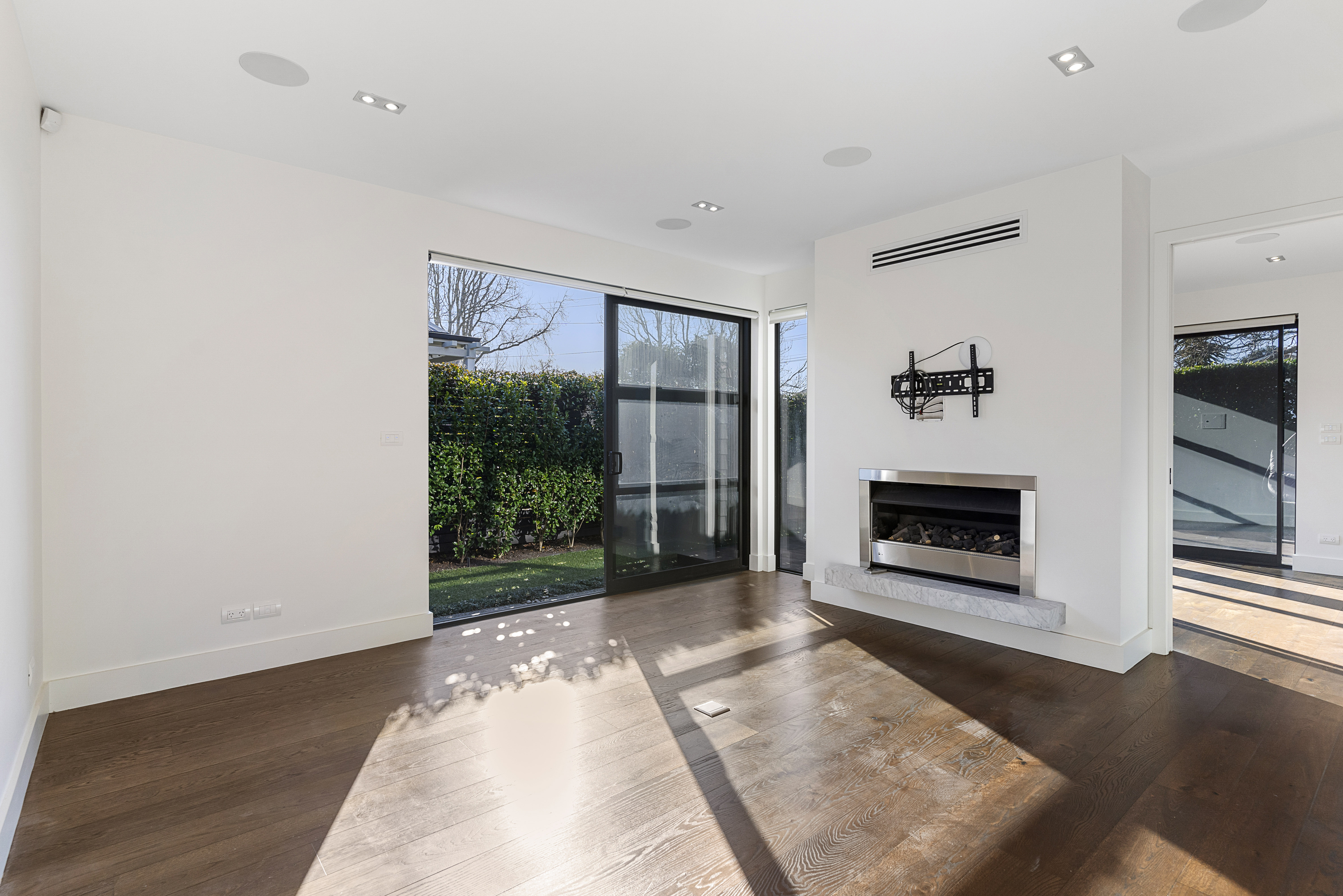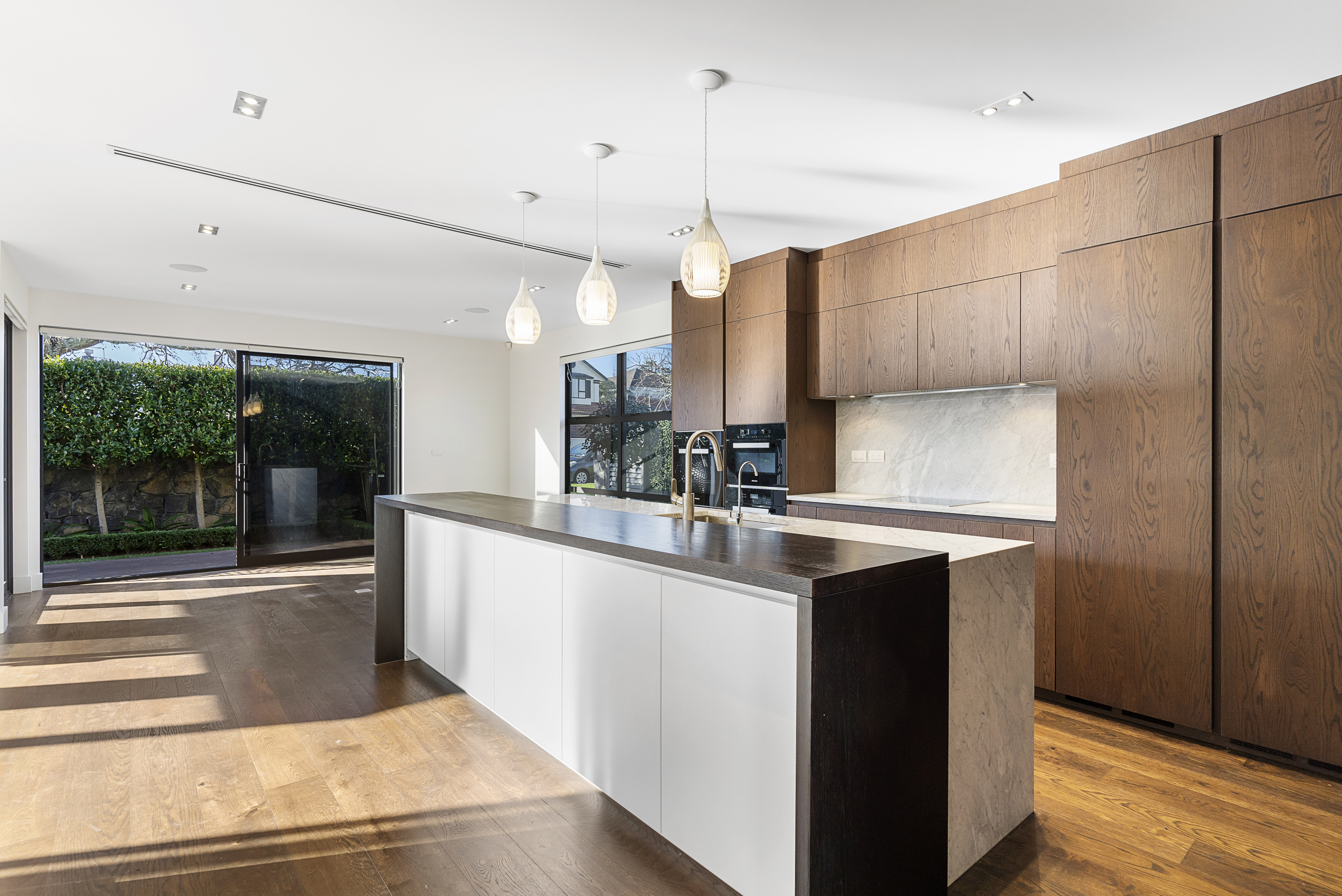 At the heart of the home, sun-filled open plan living, dining and kitchen areas create an inviting space for both everyday living and entertaining. The designer kitchen is a standout feature, equipped with premium Miele appliances including dual ovens with warming drawers, extensive storage, and a well-appointed butler's pantry to keep entertaining effortless and discreet. Large ranch sliders provide seamless indoor-outdoor flow to a private, landscaped garden-ideal for hosting guests or unwinding in a tranquil setting.