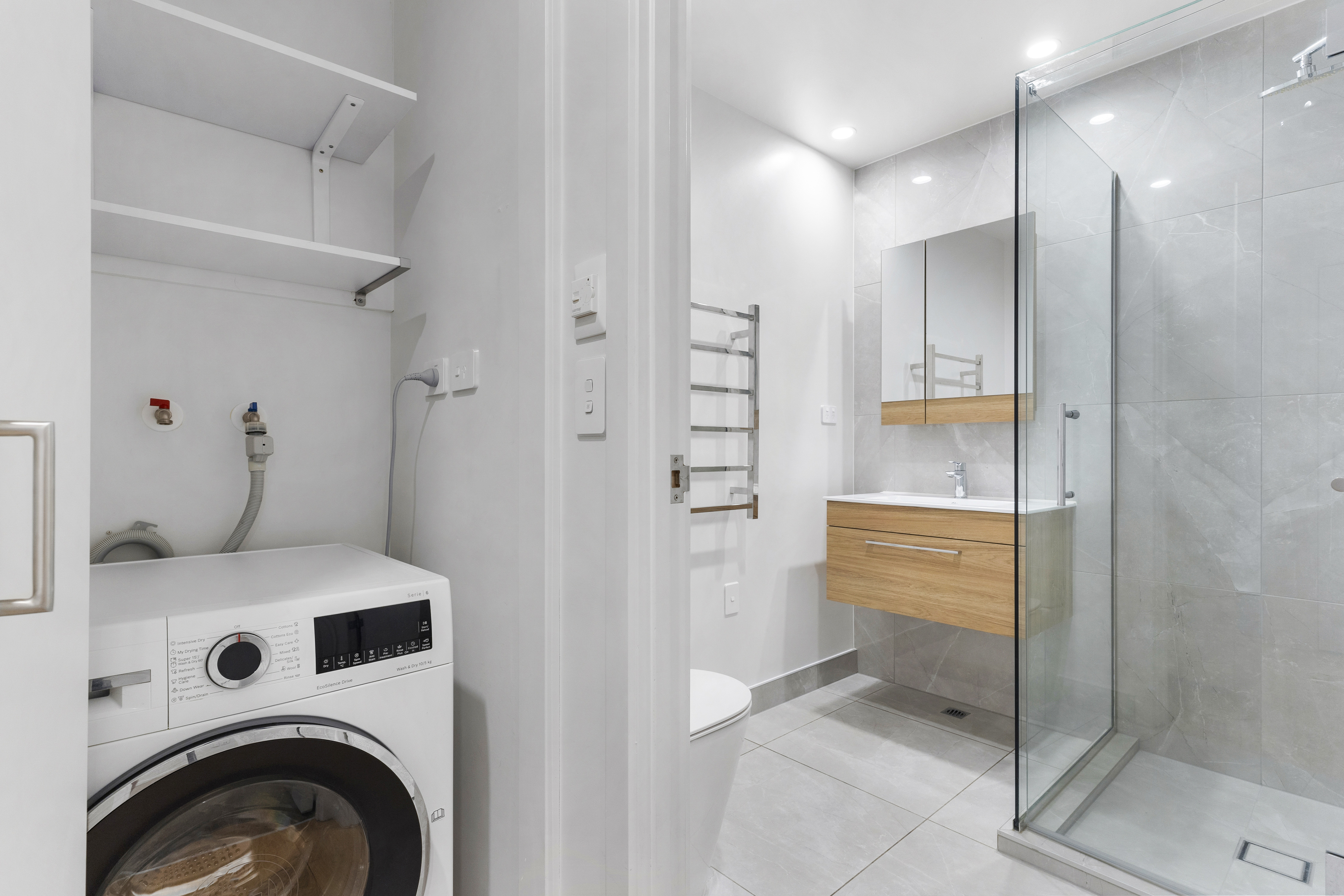 Step inside to discover a spacious open-plan living area that flows effortlessly to a covered patio with outdoor heating, ideal for year-round entertaining. Mature landscaping surrounds the patio, providing a stunning green outlook and ensuring privacy for the living and bedroom areas. The premium Bosch kitchen features sleek finishes, an island bench, and abundant storage, making it as functional as it is stylish. As a bonus, whiteware is included - washer/dryer combo and fridge.