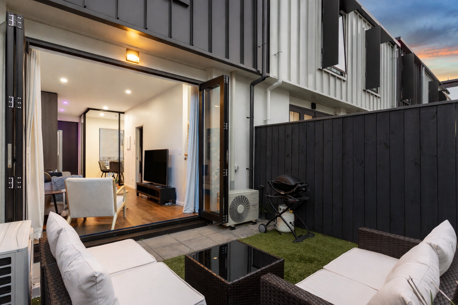 The light-filled open plan living and dining flows seamlessly to a private rear garden, complete with outdoor furniture and greenery - ideal for relaxing or entertaining during Auckland's warmer months. The contemporary kitchen is both stylish and functional, featuring quality appliances, excellent storage, and colour-adjustable LED lighting to set the tone.