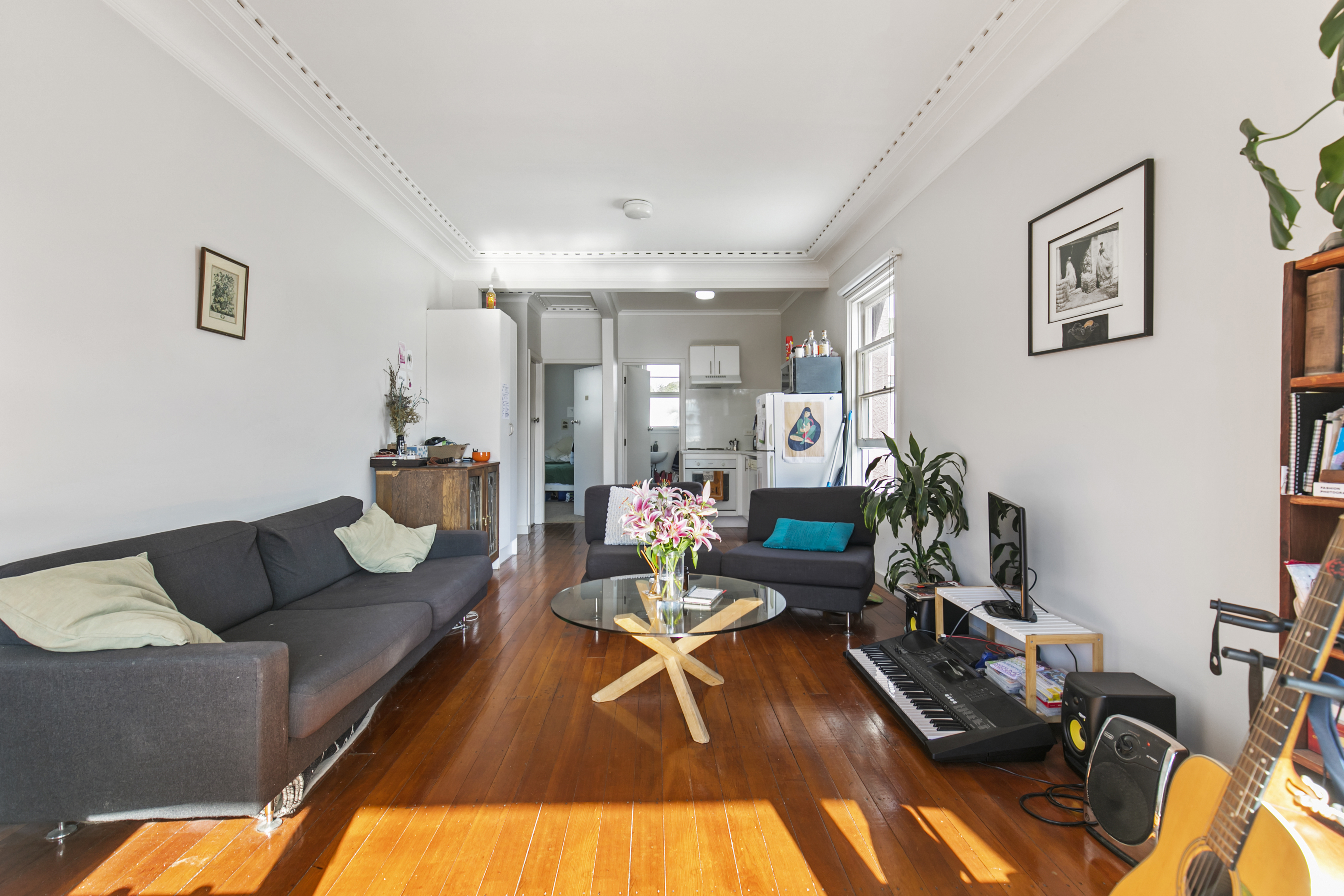 The apartment features three double bedrooms, a combined bathroom, and an open-plan kitchen, dining, and living area that flows to a private balcony - ideal for relaxing or entertaining. Thoughtful modern updates ensure everyday ease, while the Art Deco detailing adds warmth and timeless appeal.