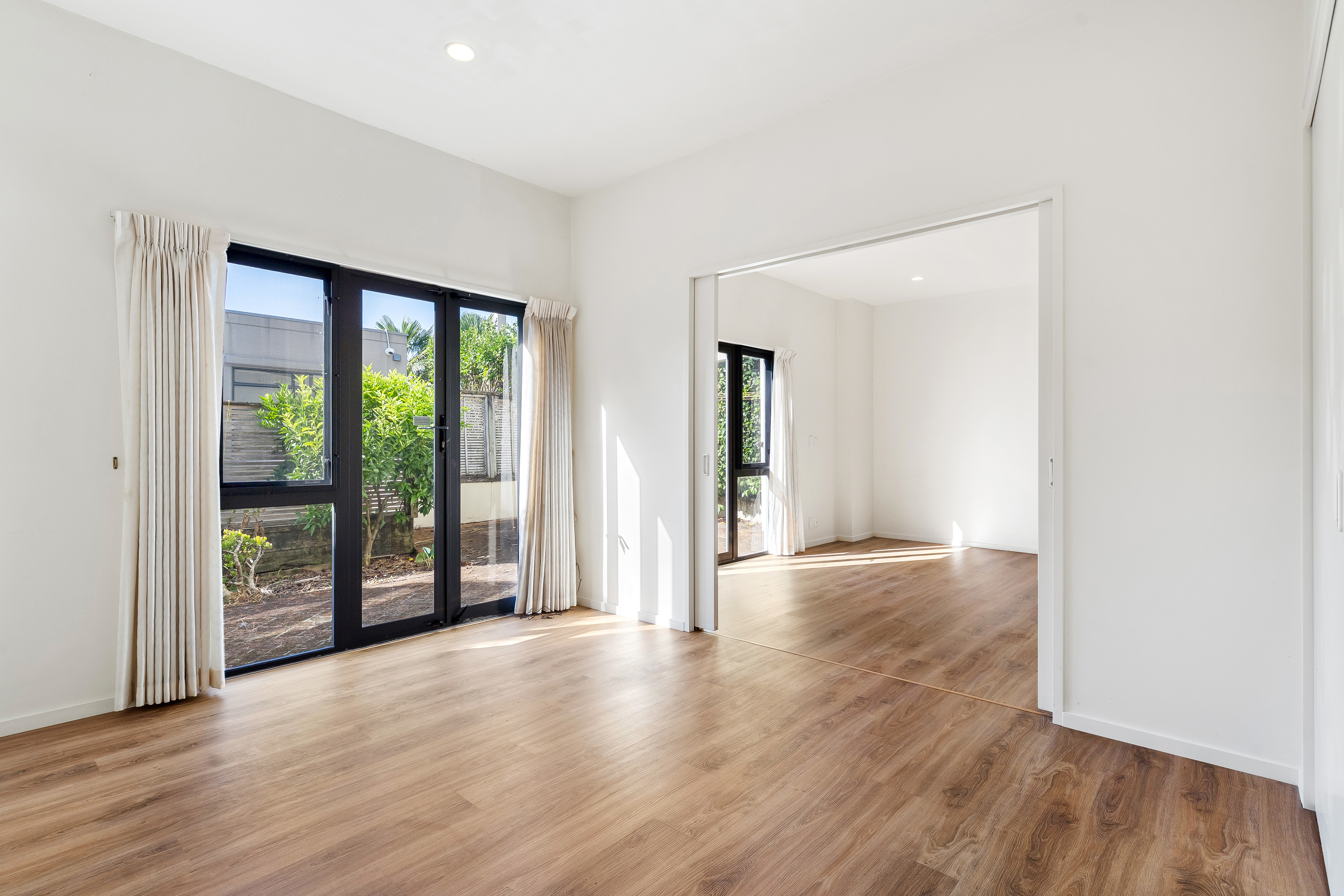 Entry Level Three well-proportioned bedrooms are located on this floor, two of which can be opened up and combined to create an oversized bedroom, second living area, or large work-from-home space --a rare and highly versatile feature. A family bathroom services this level.