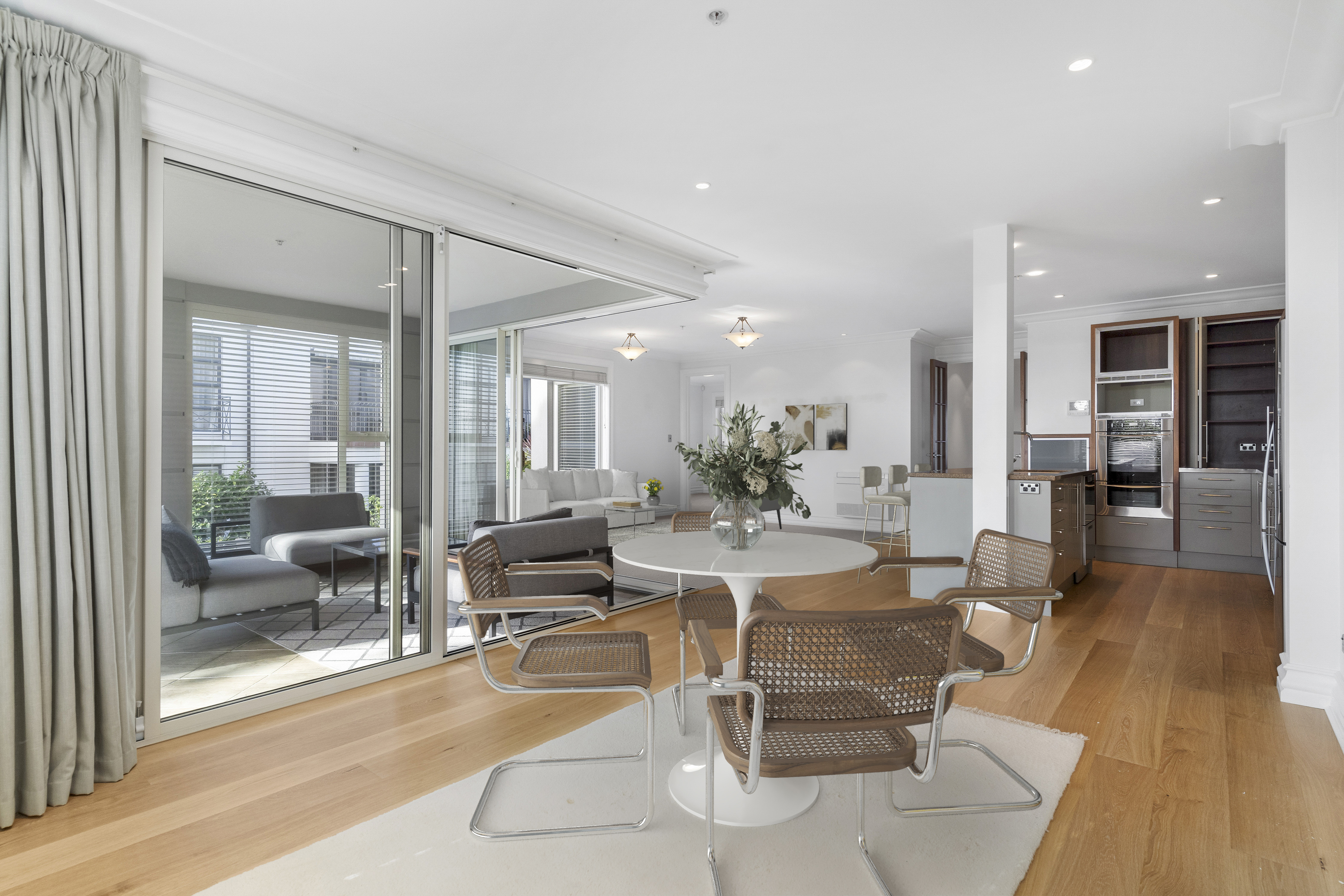 At the heart of the apartment is a large kitchen that connects seamlessly to the dining area and two separate living spaces, creating excellent flexibility for both everyday living and entertaining. An indoor loggia extends the living area and frames pleasant views across the northern slopes of Remuera. Practical features include a separate laundry and two secure car parks accessed via an automatic gate.